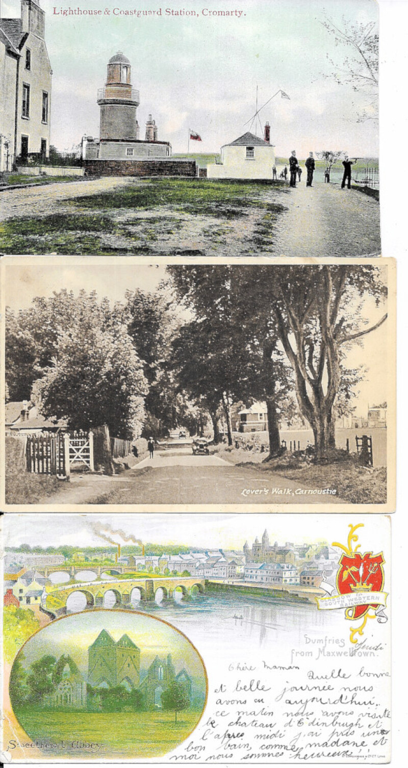 Scotland topography, an accumulation in plastic sleeves, mostly 1900s to 1940s, with some street scenes noted. No Glasgow or Edinburgh. RPs, coloured, b/w. Mainly good to fine. (abt.400)