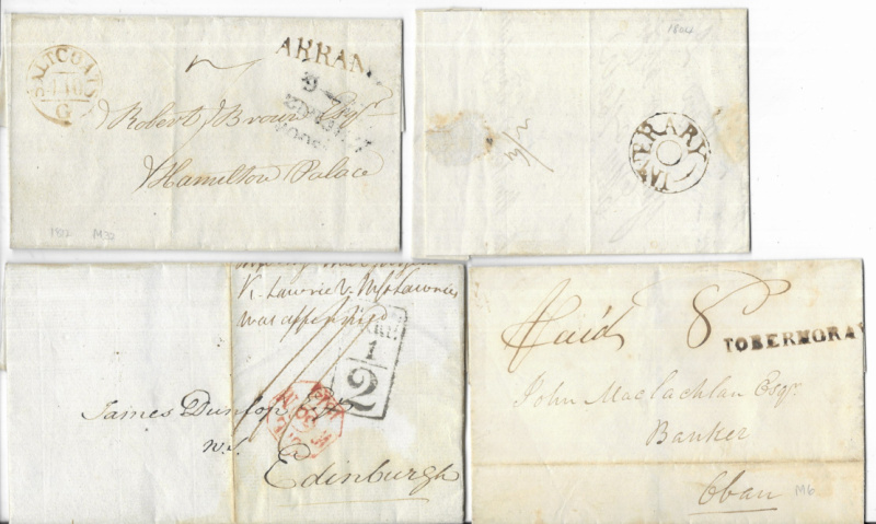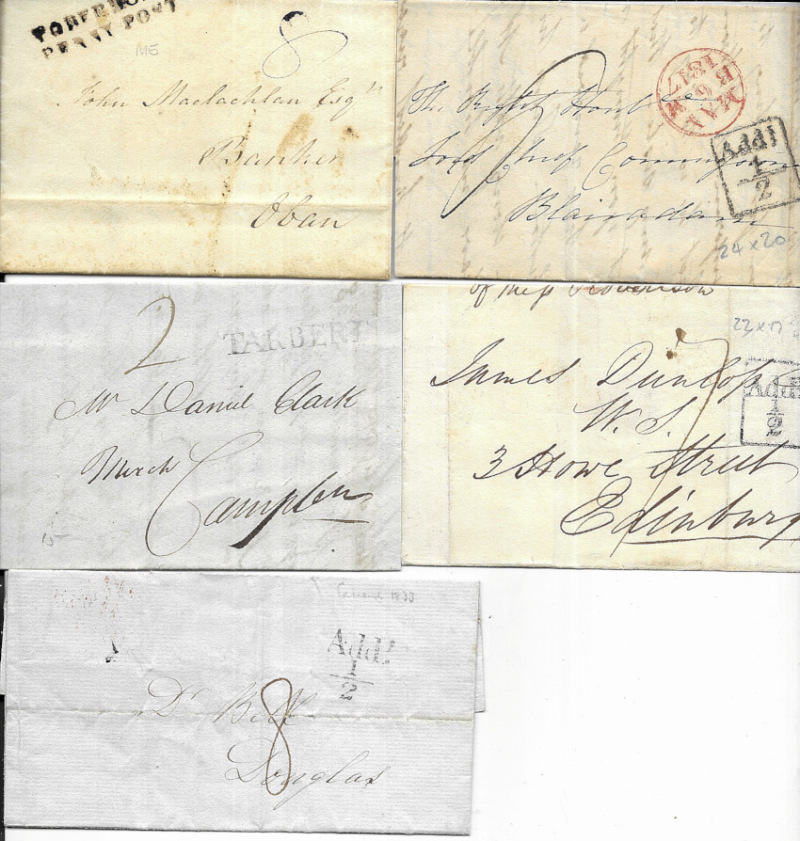 Scottish pre-stamp Entires & Wrappers, including 1767 EL with Bishop mark; s/line TOBERMORAY, ARRAN, and TARBERT; circular INVERARAY (1804); TOBERMORAY / PENNY POST: Addl.½ (17); 1786 EL Edinburgh to Glasgow with red Bishop mark, charged ‘3'; etc. Fair to fine. (29)