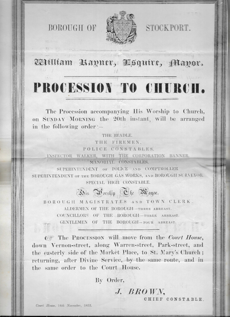 Scrapbook 1853-1856 compiled by William Rayner, Mayor of Stockport, items tipped-in or loose, including 1853 Mayoral Procession notice, 1853 Stockport Infirmary Annual Ball, 1854 Goldsmiths' Hall menu & invitation, 1855 Dinner Invitation in honour of the 2nd Regt. of Royal Cheshire Militia, 1854 Patriotic Fund notice for bereaved relatives arising from the Crimean War and related printed letter ink-signed by William Rayner, and other items (some laid down). Also 1877 notices of fund-raising events for the Stockport Infirmary and the repair of Stockport Armoury. Also many news-cuttings, mostly laid down. (Qty)