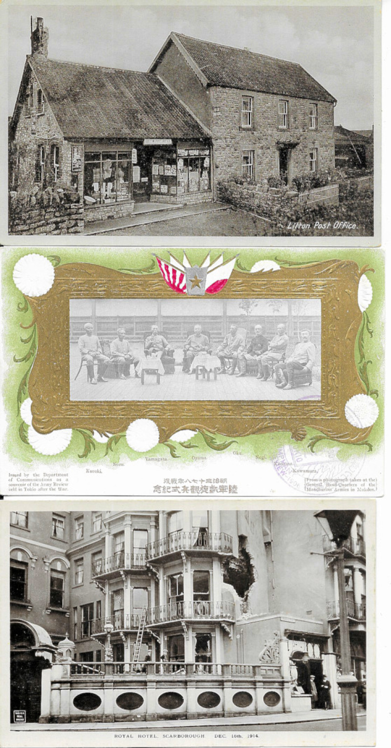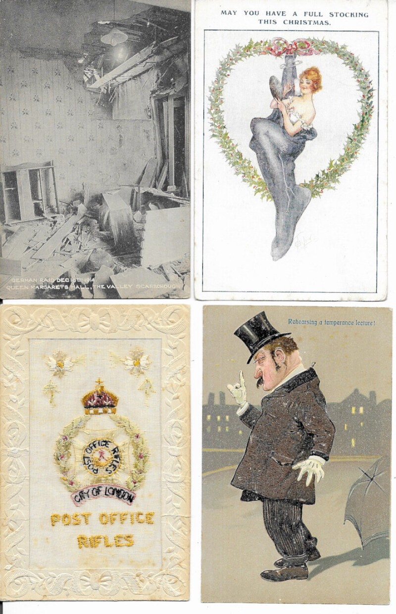 Selection including WWI Embroidered Silk City of London Post Office Rifles (slight foxing), Russo-Japanese War embossed, close-up Litton Post Office (Derbyshire), and 1914 Scarborough bombardment (3). Good to fine. (11)