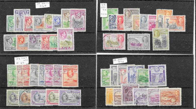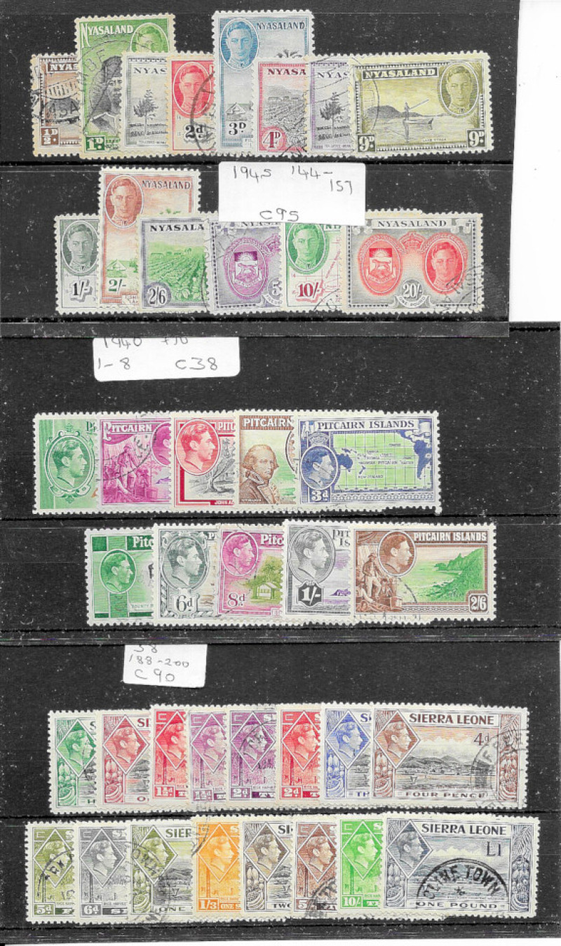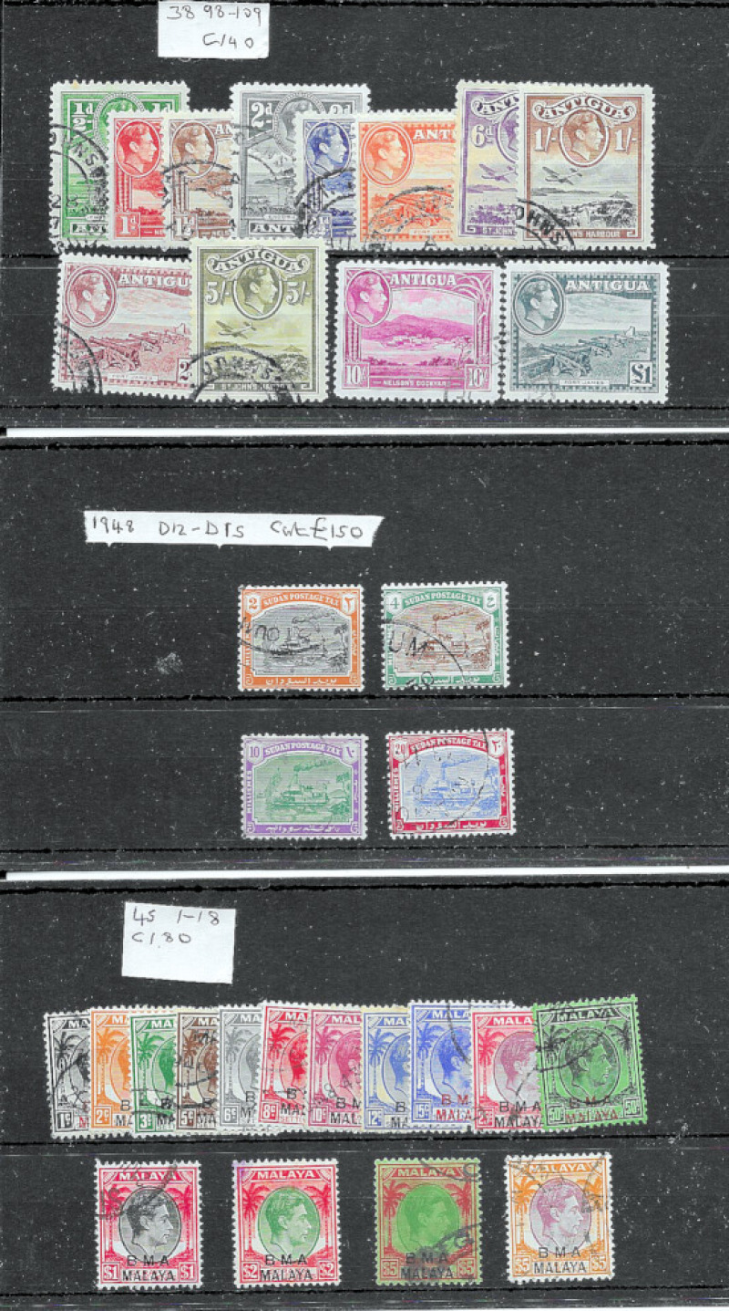 Selection of British C/Wealth George VI used definitive sets to top values comprising Sierra Leone, Pitcairn Island, Nyasaland, BMA Malaya, Gold Coast (1938 and 1948 sets), British Solomon Is., British Guiana, and Antigua. VG/VF. Also 1948 Sudan Postage Dues FU, 10mls with couple of short perfs. Cat £963