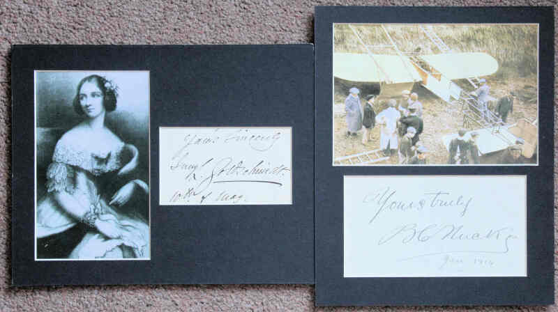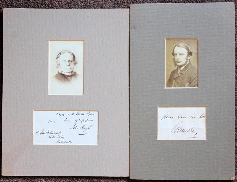 Selection of cut signatures and few autograph letters all matted with portraits including carte-de-visite photos, notably Jenny Lind (Goldschmidt), George Stephenson, Richard Cobden, John Bright, Thomas Hood, Charles Kingsley, B.C. Hucks (aviator), Austin Dobson (ALS), and William Orchardson (ALS). Most are 19th Century. (14)