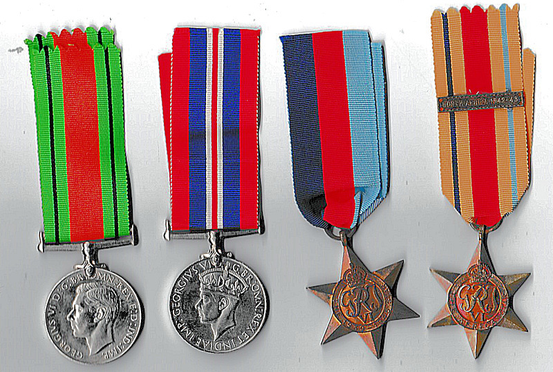 Set of 4 WW2 Medals awarded to Airman Cpl. Leslie R Spicer, RAF, of Windsor, all with ribbons, fine; includes Africa Star with North Africa 1942-43 bar. Also Service book and insignia.