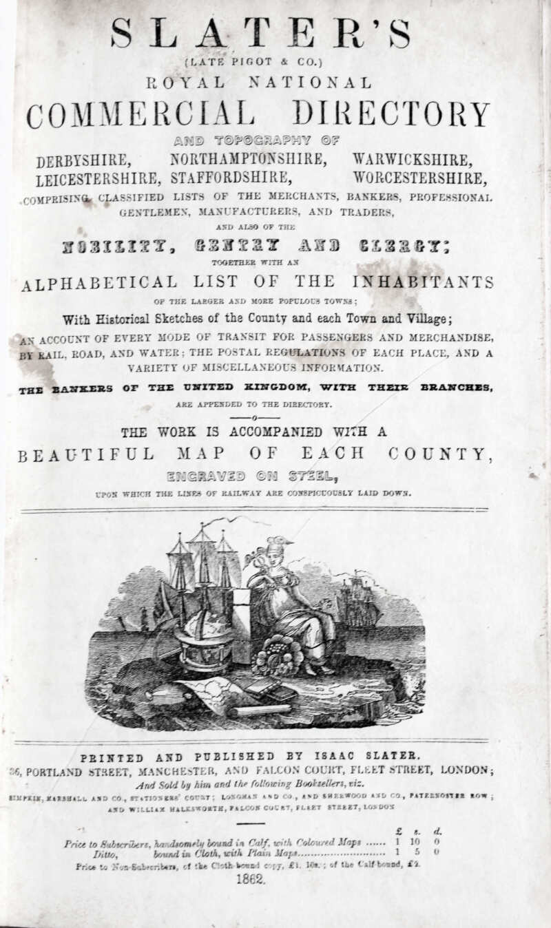 Slater's Royal National Commercial Directory – Staffordshire, Isaac Slater, 1862, in a fine 20th Century quarter-morocco binding, gilt; title page with some tone marks, fine hand-coloured folding map. 178pp of advertisements at rear and coloured 4pp brochure of Royal Insurance Co. bound in; (8),232,178,(4)pp