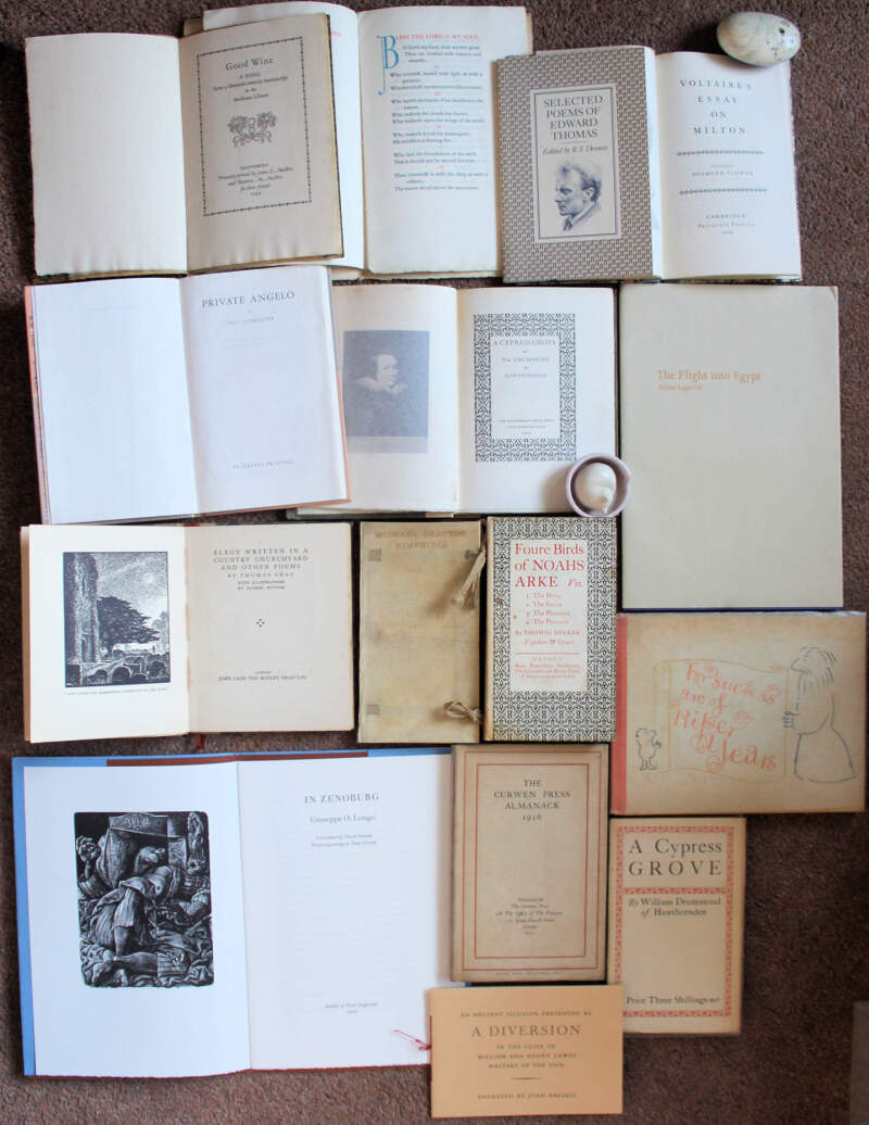 Small books & pamphlets, many private press, UK & American, including Shakespeare Head Press (4), The Society of Wood Engravers (2), Curwen Press, Whitehead & Alliger, William E. Rudge's Sons, E. Grabhorn (San Francisco), Rampant Lions Press, James & Beatrice Masters, De la More Press (3), etc. Also two greetings cards and a menu. 1900s to modern, all periods represented. Good to VF (34 items)