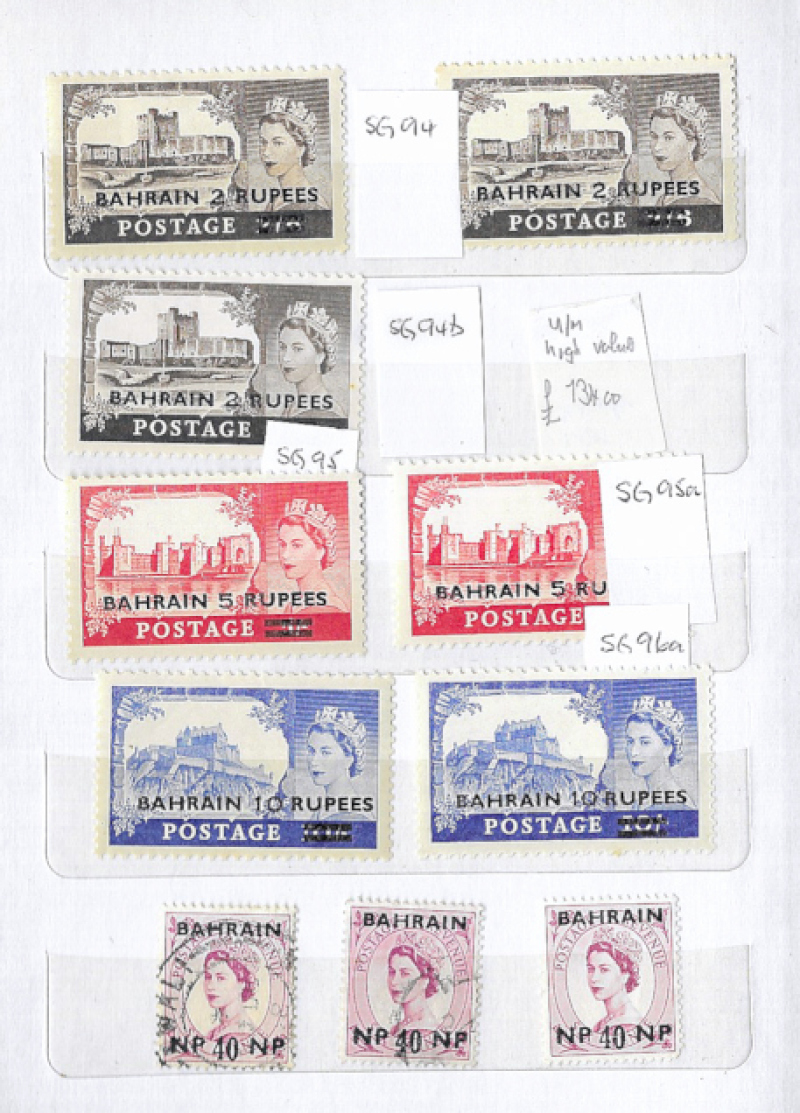 Small s/book with GB overprints for Bahrain and Bechuanaland, with better Bahrain including SG 94 to 96a UM, and some fiscally used QV high values of Bechuanaland. (92)