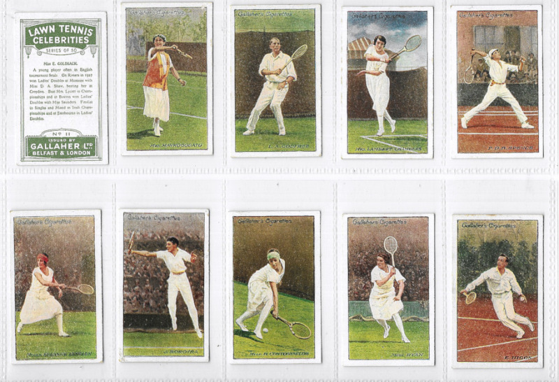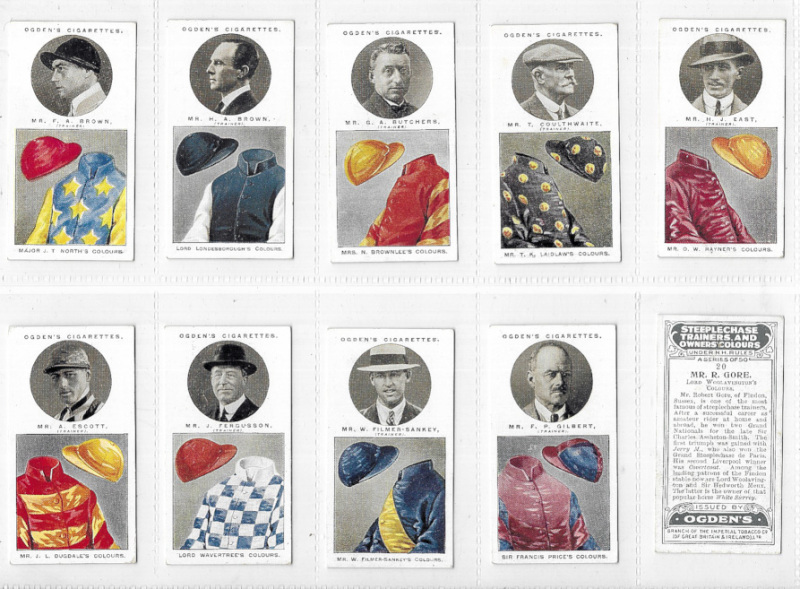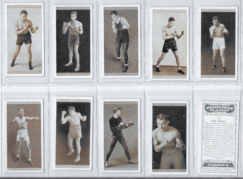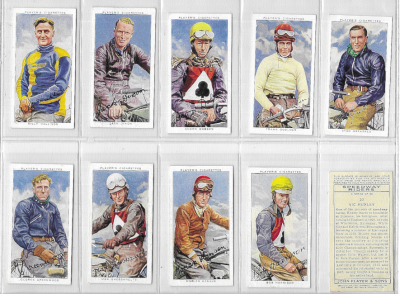 Sports interest, a collection of 17 sets in album including Churchman Sporting Trophies (the set of 25) and 3 Jovial Golfers; Carreras (Turf) Sports Series and Famous Footballers; Player Speedway Riders and Racing Caricatures; Ogden Pugilists in Action and Steeplechase Trainers and Owners' Colours; Gallaher Lawn Tennis Celebrities; Boguslavsky Sports Records 1st & 2nd series; and Hignett International Caps and Badges. VG or better, mainly excellent. Cat (Murray) £1580.