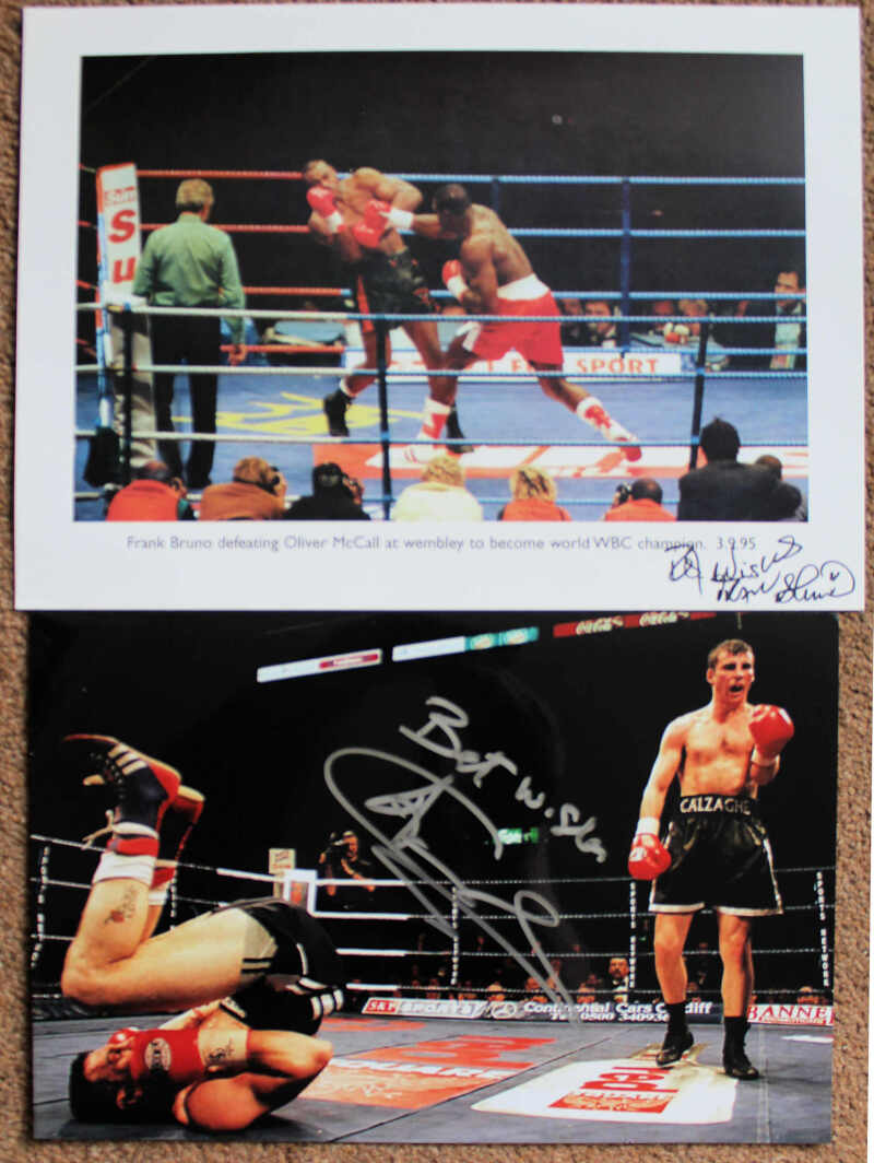 Sports Personalities and Entertainers' Autographs comprising large photos and programmes (2) including Joe Calzaghe (2), Jack Brabham, Neil Sadaka, David Coulthard, Frank Bruno, Richard Dunwoody, Stephen Redgrave, Geoff Boycott and other well-known. (12)