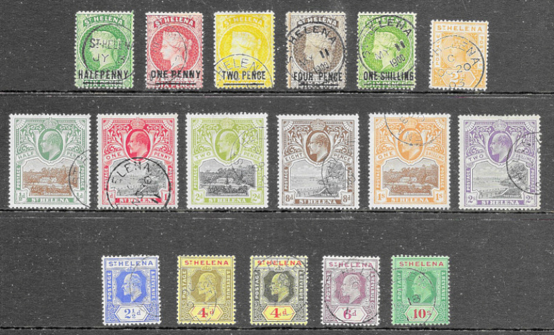 St. Helena QV & EVII VFU selection with QV surcharges to 1s, EVII pictorial issues to 2s, and EVII key plates to 10s. Cat £700 approx. (17)