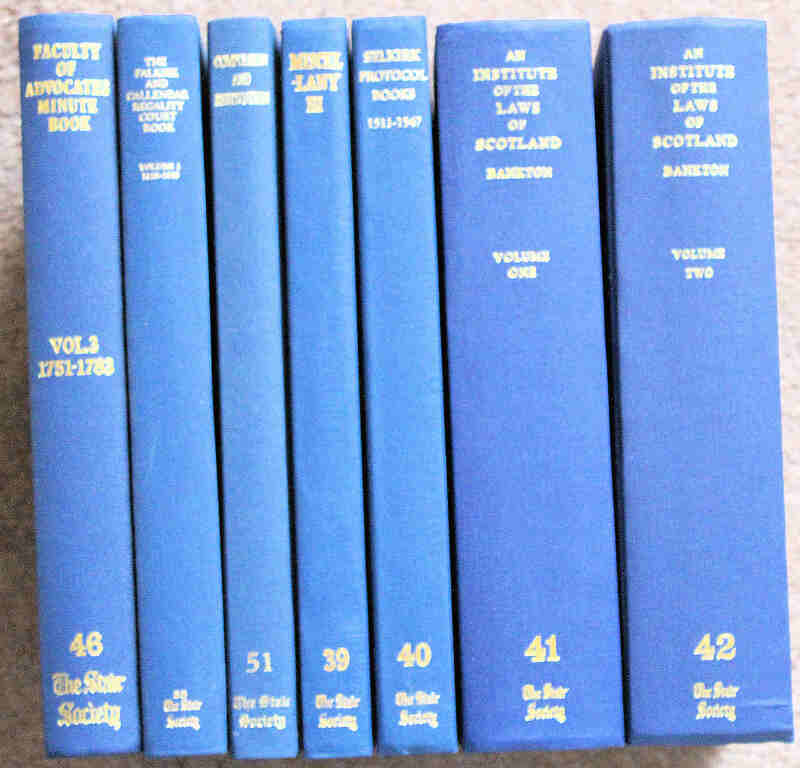 Stair Society publications including Andrew McDouall [Bankton] An Institute of the Laws of Scotland in Civil Rights Vols. 1 and 2, 1993/94 reprints; and five others. Gilt cloth, fine. (7)