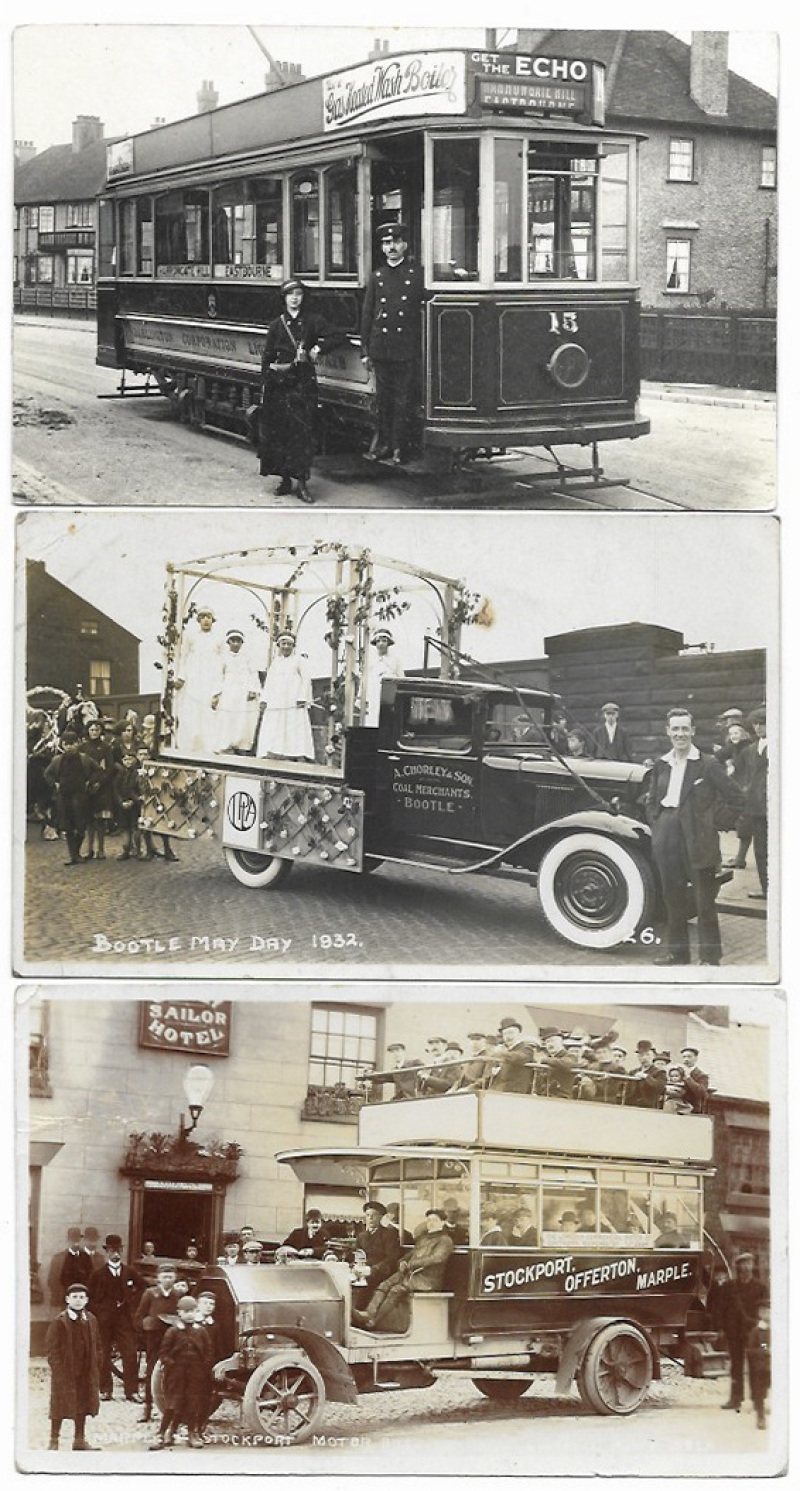 Transport selection, all close-ups including better RPs with impressive Stockport Motor Bus (PU 1905), Bootle May Day 1935,