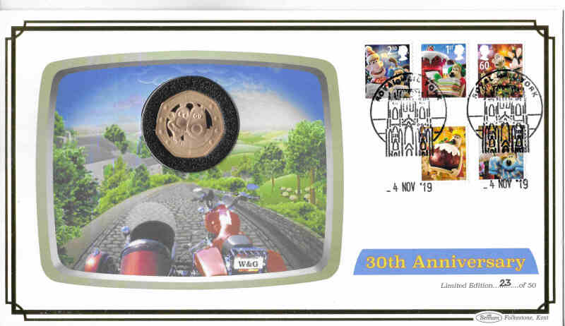 UK 2019 ‘Wallace & Gromit' 50 pence Gold Proof, 22ct, inset in a related commemorative cover, with certificate. Coin weight 15.5grms