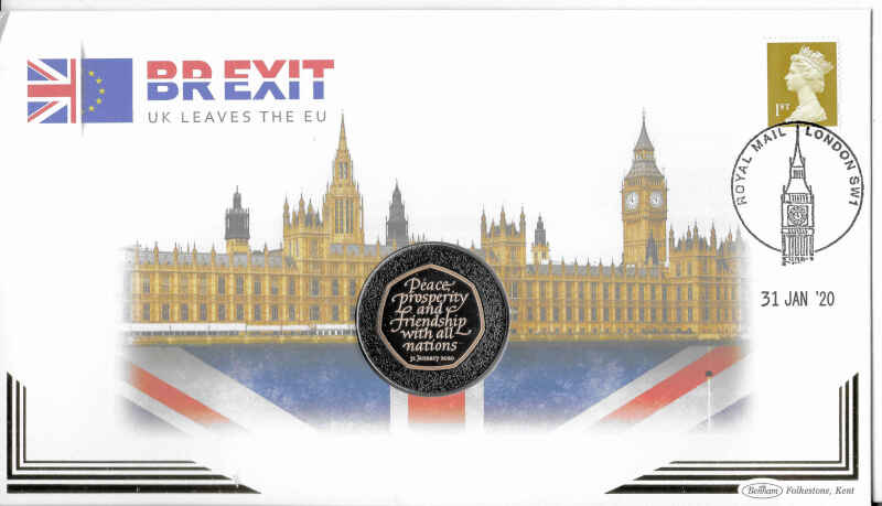 UK 2020 Brexit 50p Gold Proof Piedfort, inset in a related commemorative cover, with certificate. Coin weight 31grms.