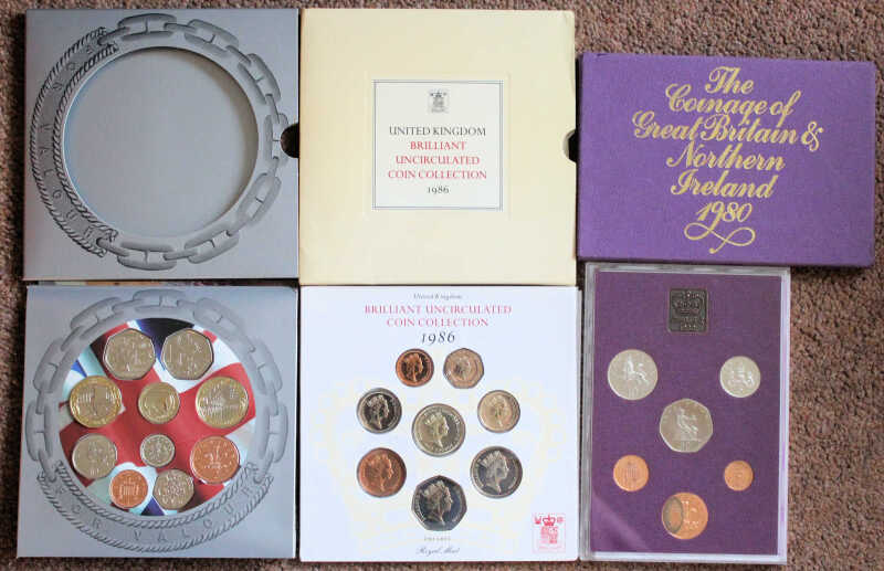 UK Coin sets in issued packs comprising 1967/71 Last Sterling / First Decimal; Year Sets for 1977, 1978, 1980, 1986, 2005, 2006, and 2007; and few single coin packs.