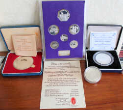 UK Commemorative .925 Silver Coins & Medallions, 1973-2002, most with a Proof finish, total silver weight approx 200grms (8 items)
