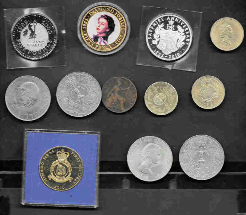 UK selection including 1999 Millennium Five Pounds Silver, and 2018 Queen's Sapphire Coronation Anniversary Five Pounds Silver Proof, total coin weight 60grms; together with nine assorted coins and a medallion including 2012 Guernsey 24carat gold-plated 50p with a proof finish.