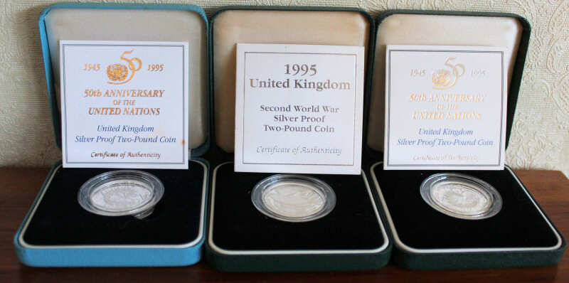 UK Silver Proof Two Pounds for 1994 (Bank of England), and 1995 (WW2 and two United Nations); and Five Pounds Silver Proofs for 1981 (Royal Wedding) and 1997 (Golden Wedding), all in the issued cases with C.of A. Silver weight 120.48 grms. (6)
