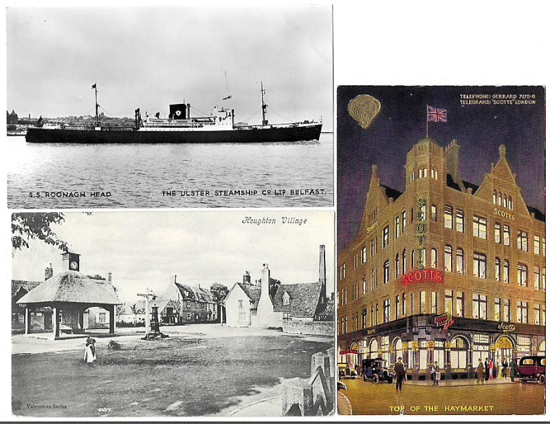 UK topography plus some USA, Japan & few other foreign, greetings, merchant shipping and art topography; some interest in Carnforth area including RPs, Irish Sea steamers (18), Lynmouth Floods RP, South East of England including London, and others. Fair to VF (abt. 600)