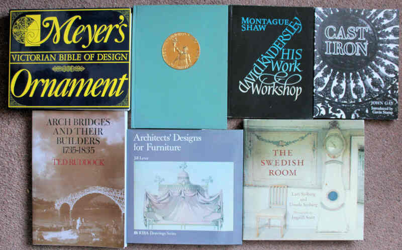 Vernon Estate Fences: Their Choice, Construction & Cost 1899; Meyer A Handbook of Ornament 1974; Ruddock Arch Bridges and their Builders 1735-1835, 2008; Kilby The Cooper and his Trade, 1971; Burke The Making of Dutch Towns, 1956; Sjoberg The Swedish Room 1974, and various others. Many in d/jkt. VG/VF (17)