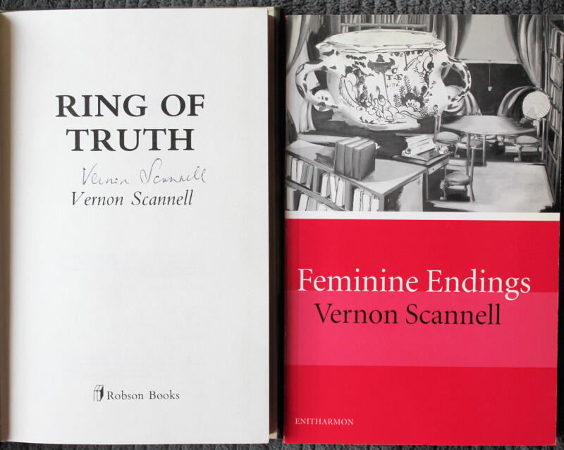 Vernon Scannell selection of first editions, three signed by the author, comprising The Tiger and the Rose 1971 in d/jkt, Ring of Truth 1983 in djkt (signed), The Loving Game 1975 (signed, in price-clipped d/jkt), Feminine Endings 2000 (signed s/bk), and Of Love and War 2002 in d/jkt. No ownership inscriptions etc. VG/VF (5)