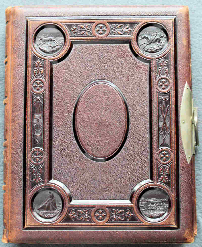 Victorian Photograph Album (without photos) intended for Sporting mementos with attractive illustrated pages, quarto, full leather with metal clasp, VG; plus a partly filled 19th Century scrap album with printed pages; and two commonplace books of drawings & verses. Fair to VG (4)