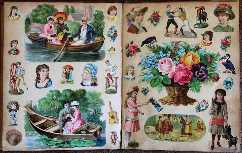 Victorian Scrap album dated 1883, with an attractive range of chromo-litho scraps, hand-coloured wood-engravings, lithographs, and few greetings cards; with animals, children, politicians, ladies, clowns etc, some large. Quarto, 42pp, 100s of items.