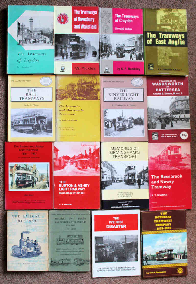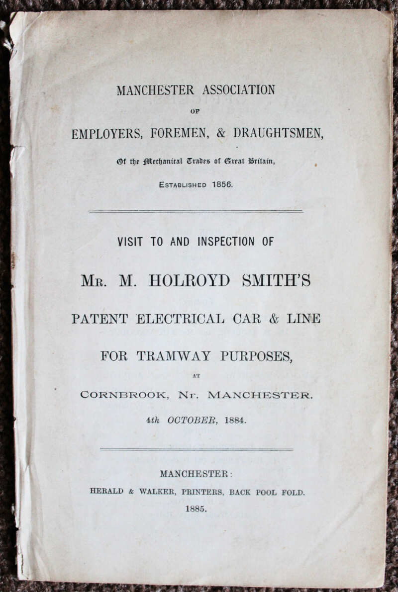 Visit to and Inspection of Mr. M. Holroyd Smith's Patent Electrical Car & Line for Tramway Purposes, Manchester 1885, 16pp pamphlet, disbound; and other UK Tram history and nostalgia, 1940s to 1990s, A5 format, some h/bk but mostly s/bk publications with much local history interest. Fair to VF. (132)