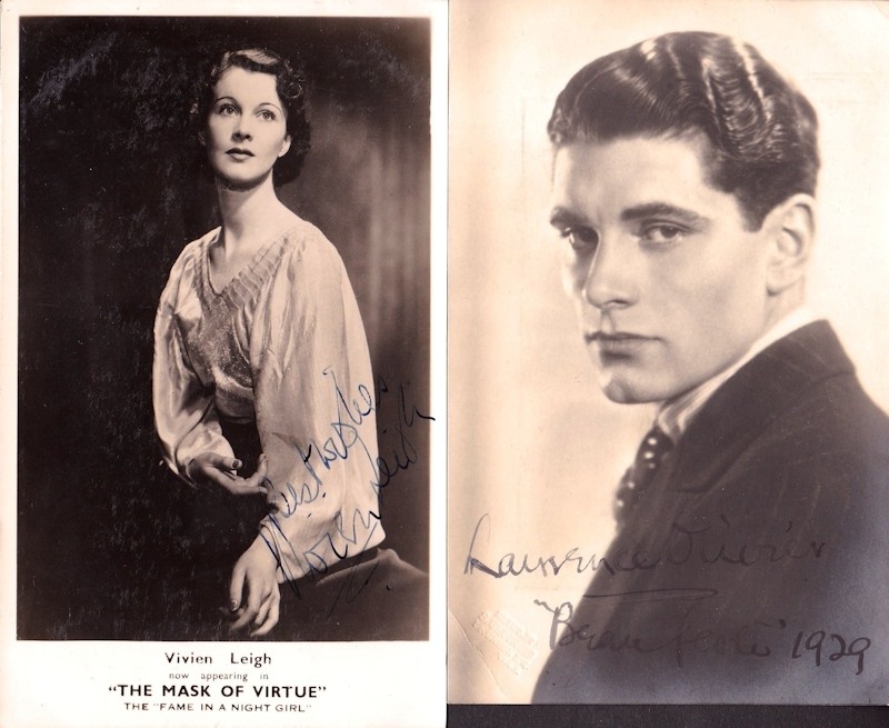 Vivien Leigh and Laurence Olivier, scarce early autographed PC size photos, Olivier's additionally inscribed Beau Geste 1929, Vivien Leigh's with publicity text on reverse for The Mask of Virtue 1935 at the St. james's Theatre. Olivier photo with newscutting tipped on to reverse, otherwise fine.