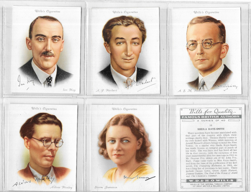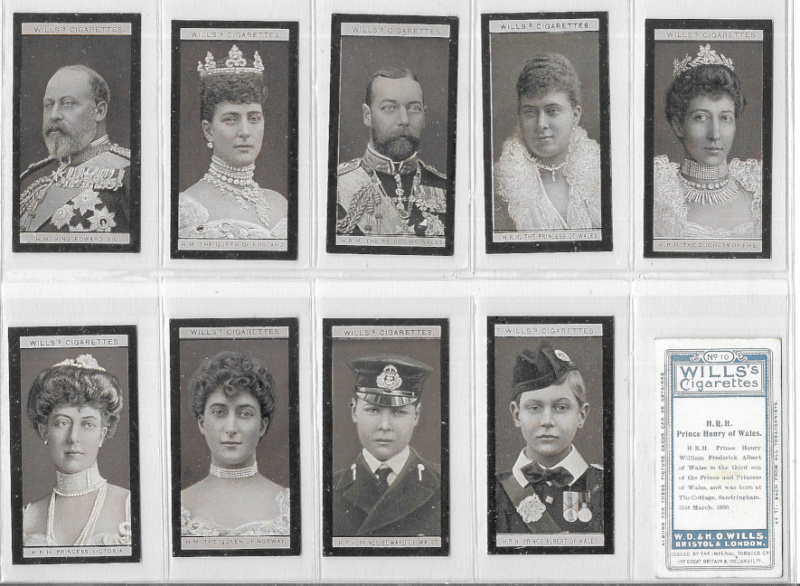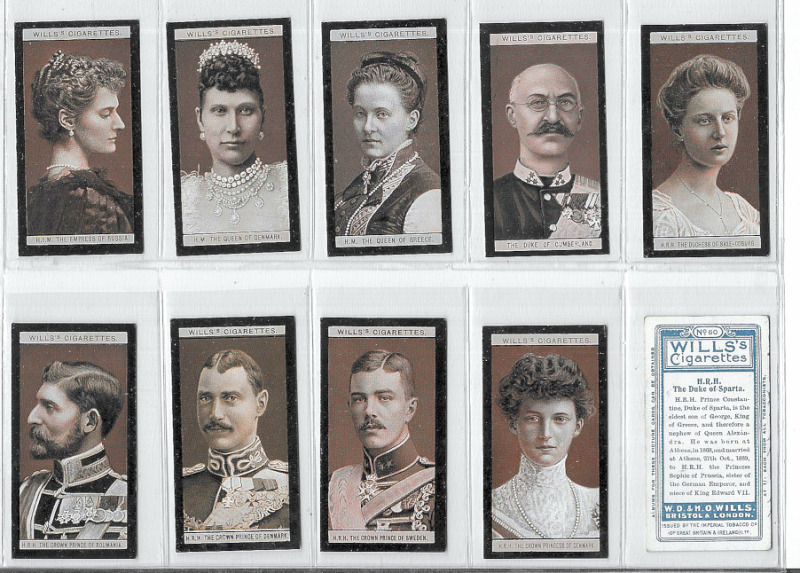 Wills sets in modern album including Portraits of European Royalty 1908 (the two sets of 50), Arms of Oxford & Cambridge Colleges, Cricketers 1928, Famous British Authors, Time and Money in Different Countries, and Famous Inventions. VG to excellent condition. (12 sets)