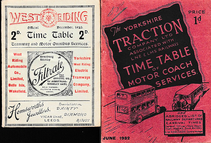 Yorkshire Bus Timetables, all pre-WW2, comprising Yorkshire Traction Co. Ltd. June 1932 and April 1934, West Riding Tramways & Omnibuses 1923, East Yorkshire Motor Services 1932, and York-West Yorkshire 1935 and 1937; also York Train & Bus Guide 1953. Four with folding maps. Good to Fine. (7)