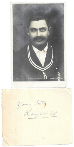 Ranjitsinhji: an autographed page, together with a PPC of the famous Indian cricketer. Album corner marks.