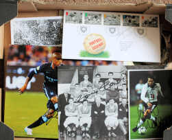 Football autographs, with many signed pages and cuttings, some signed photos including Youri Tielemans, Paul Merson, Bobby Charlton and Tom Finney, and Neil Sullivan signed glove. Also few other sports autographs, and unsigned 1966 issue of Charles Buchan's Football Monthly. (79)