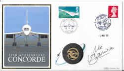UK (Alderney) 2019 50th Anniversary of Concorde One Pound Gold Proof, inset in a commemorative cover, signed by Mike Bannister, with certificate. Coin weight 8grms