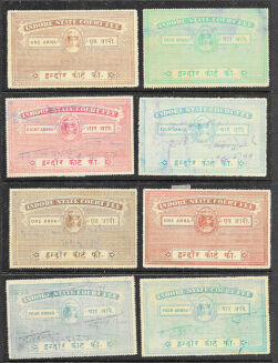 Indian States Court Fee stamps, mostly Indore (Holkar) with duplication, and a selection of Travancore-Cochin; some with hole-punch cancels. (120)