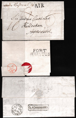 Scotland Pre-stamp to 1850s Covers & ELs including 1796 INVER / NESS in circle, 1790 AIR with “Missent to” in MS, 1789 FORT / AUGUSTUS, 1792 INVERNESS, later Locals of GLENELG, CORPACH and CLACHNAHARRY. Mostly VG to VF strikes. (14)